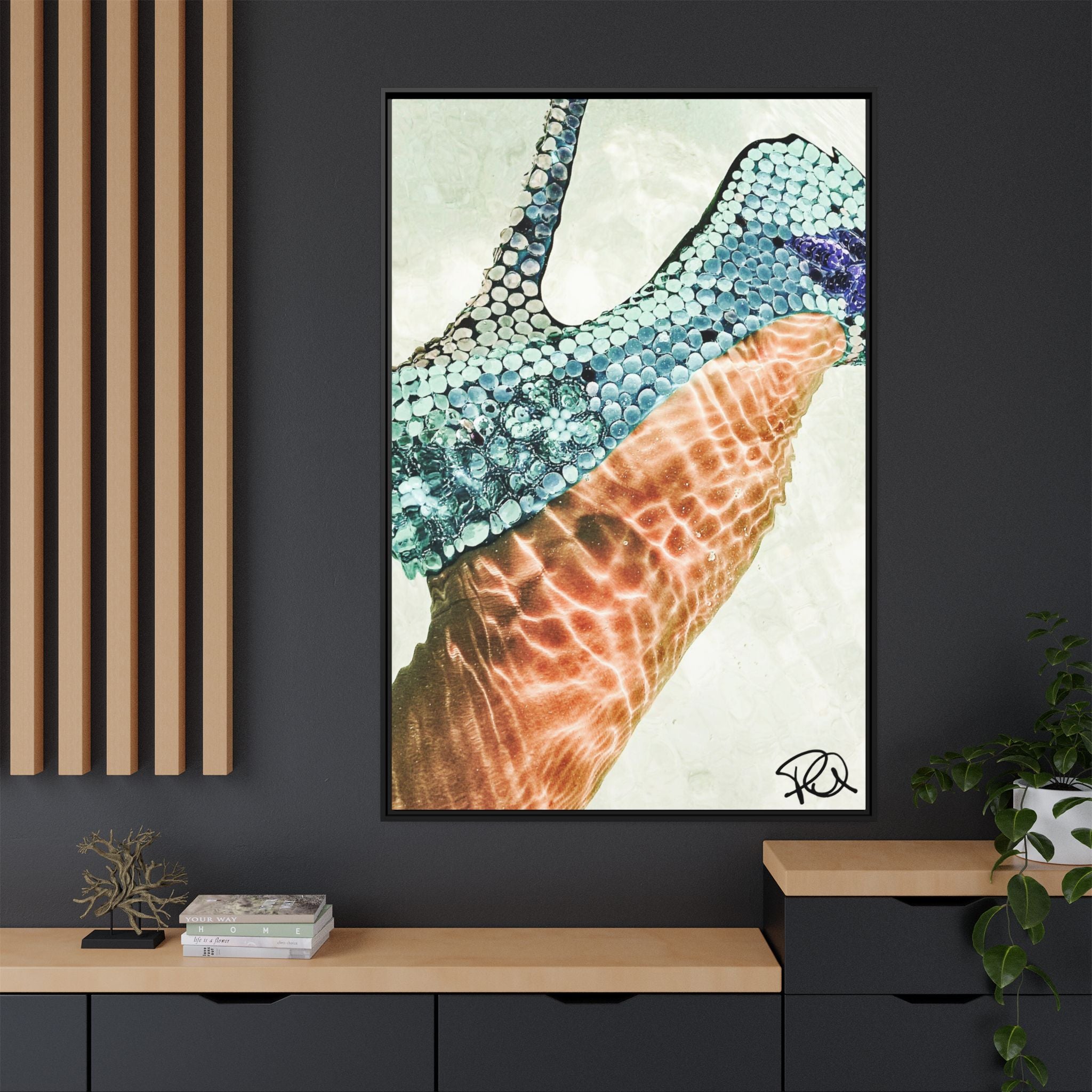 A framed matte canvas Kilame Shoe print that brings a slice of sunlit seaside texture into your home. The image captures shimmering scales and warm, rippling light — a study in color and motion that feels both modern and organic. Carefully stretched over a sustainably sourced pine frame and printed with UL-certified Greenguard Gold latex inks, this piece keeps colors vivid while remaining non-toxic and low-odor.
