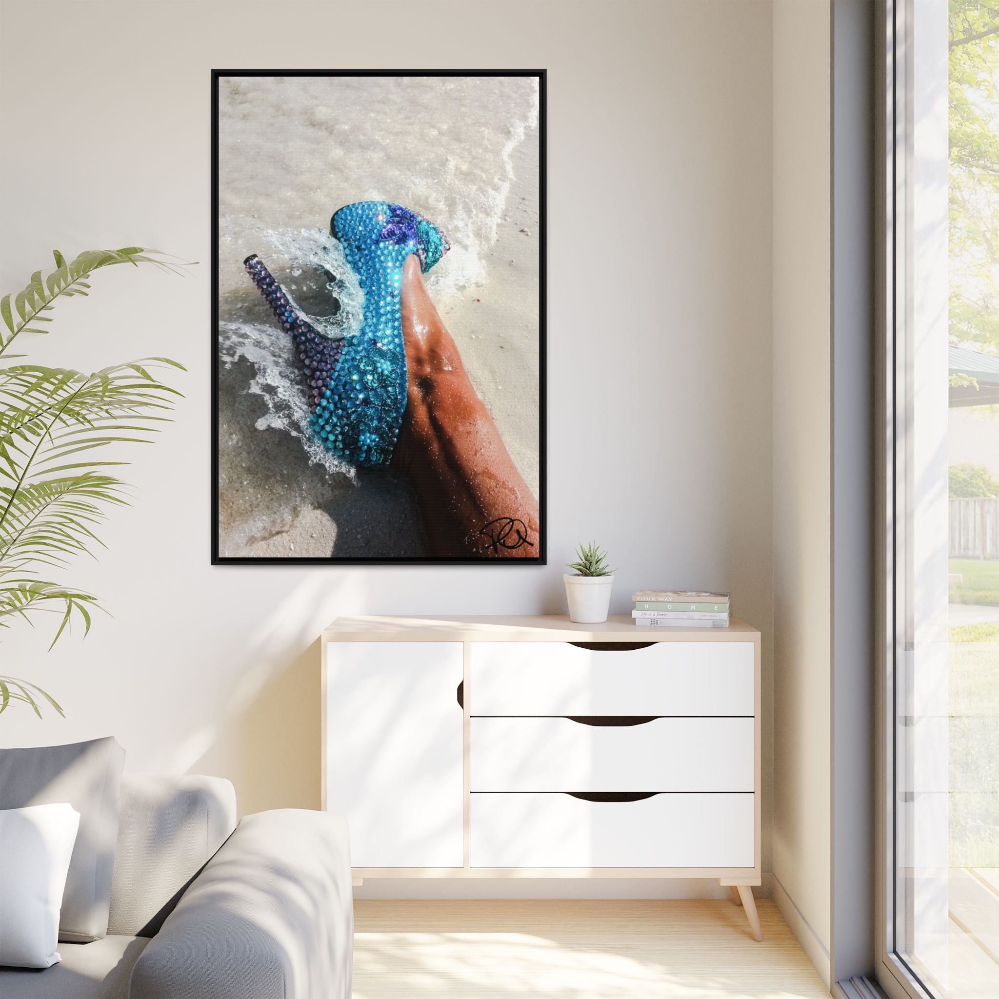 A framed matte canvas Kilame Shoe print that brings beachside glamour into your space. The image captures a sparkling, jewel-toned shoe half-submerged at the shoreline—sunlit sand, foamy surf, and a flash of turquoise and cobalt that feel alive against the muted matte surface. The slim pine frame in a choice of finishes keeps the look modern and gallery-ready while the textured canvas coating gives depth to highlights and retains fine detail. It hangs easily with sawtooth hardware and is made with sustainable materials and low-impact latex inks, so it looks beautiful while fitting into an eco-conscious home.